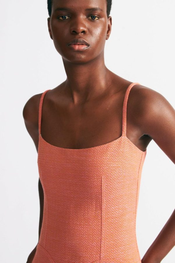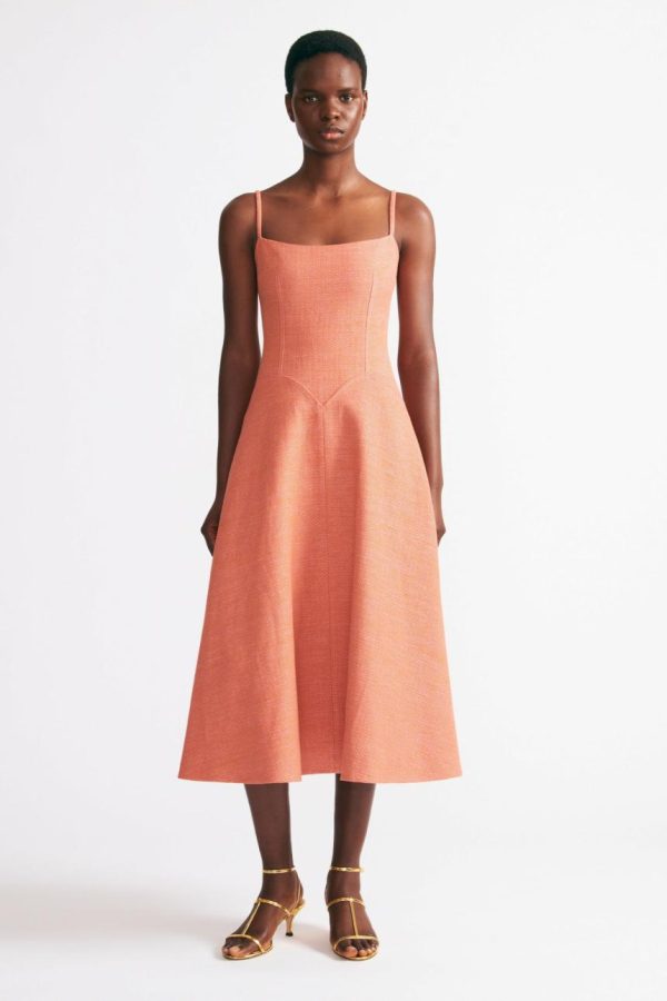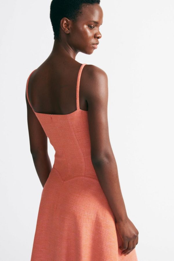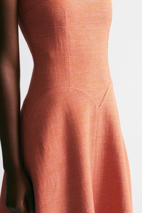 The Esha midi dress is crafted from chevron weave in a rose and tan. Cut with a wide-set square neckline, this midi dress is designed for a close fit through the bodice the featured corsetry inspired details. Added volume through the skirt offer a universally flattering fit, creating beautiful movement when you walk.