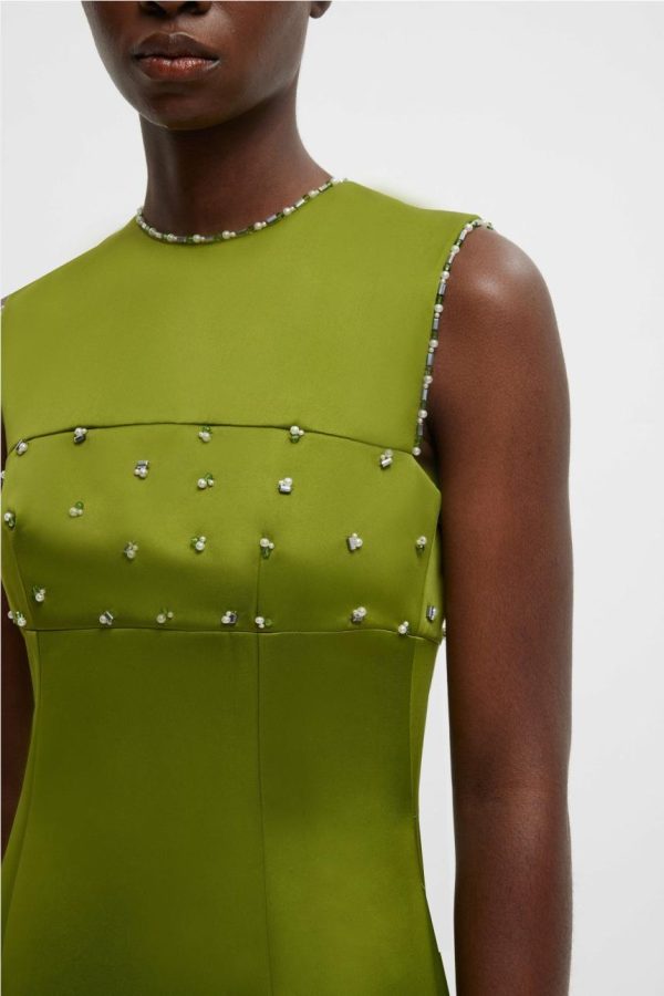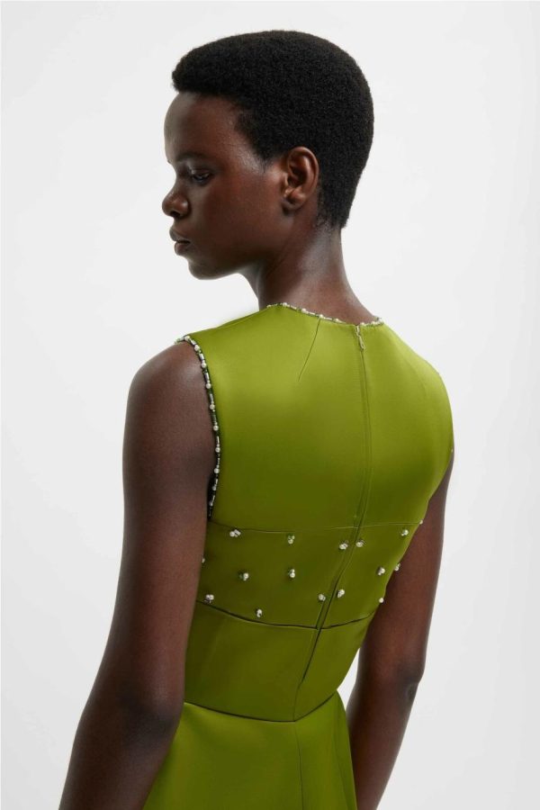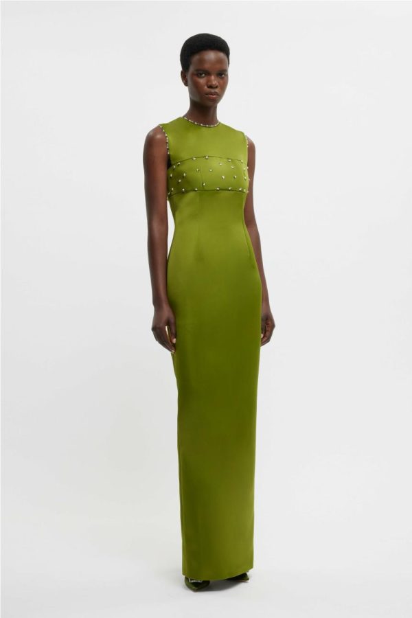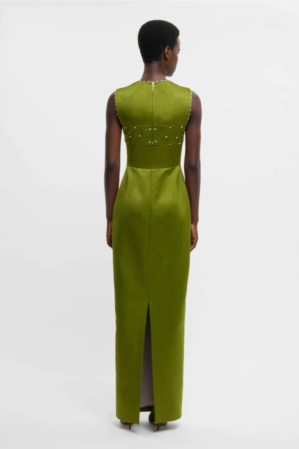 Sculpted from a weighted quality of bonded satin, the Amadine dress is s sophisticated option for occasion dressing. In a deep olive green hue, this green embellished floor length dress is dotted with understated beading across the bust and framing the neckline and armholes. Finished with a back vent for ease, pair yours with the coordinating Haydee jacket for a modest approach to evening allure.