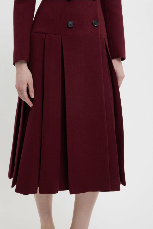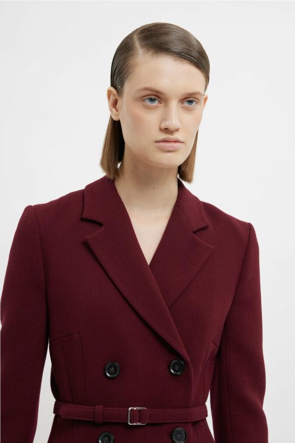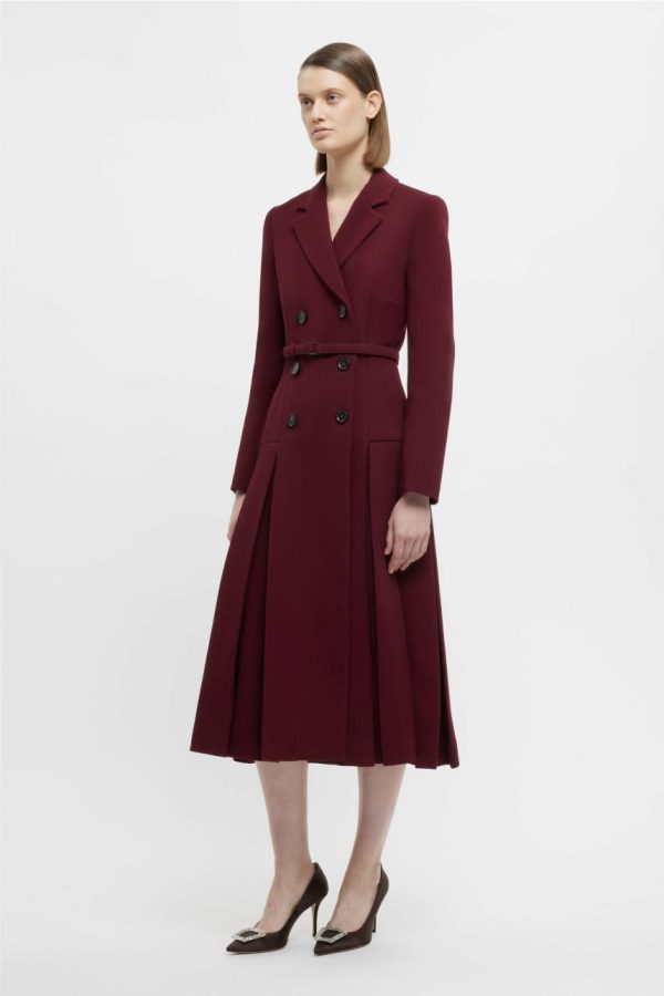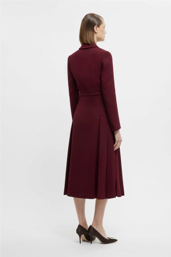 The Chaney Dress is a harmonious blend of classic tailoring and contemporary elegance. Crafted from luxurious double crepe fabric in a rich burgundy hue, this dress radiates sophistication. The pleat detailing texture and fluidity, while a tailored belt cinches the waist, creating a flattering silhouette. Whether for a formal event or a polished everyday look, the Chaney Dress is a versatile addition to your wardrobe, offering timeless style.