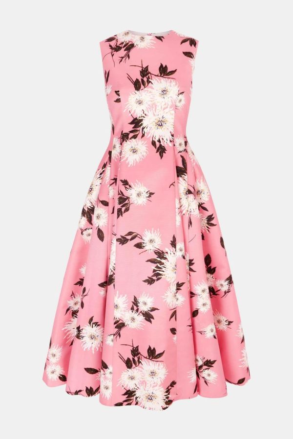 Elevate your evening ensemble with the Chelsea midi dress, meticulously crafted in lightweight taffeta faille. Its elegant design boasts darted seams that sculpt a structured fit through the bodice, while a flared skirt cascades gracefully from the waist, commanding attention with every movement. In a captivating white floral print with a pink base, this dress exudes timeless charm and sophistication, making it the perfect choice for any special occasion.
