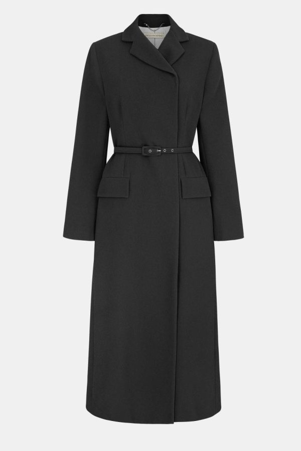 The Kalonice wrap coat dress, a fusion of classic tailoring and modern sophistication. Crafted from luxurious double crepe fabric in a captivating black shade, this coat dress exudes timeless elegance. Delicate pleat detailing on the back adds texture and movement, while a sleek belt cinches the waist for a flattering silhouette. Elevate your wardrobe with this versatile coat dress, perfect for both formal occasions and everyday chic.