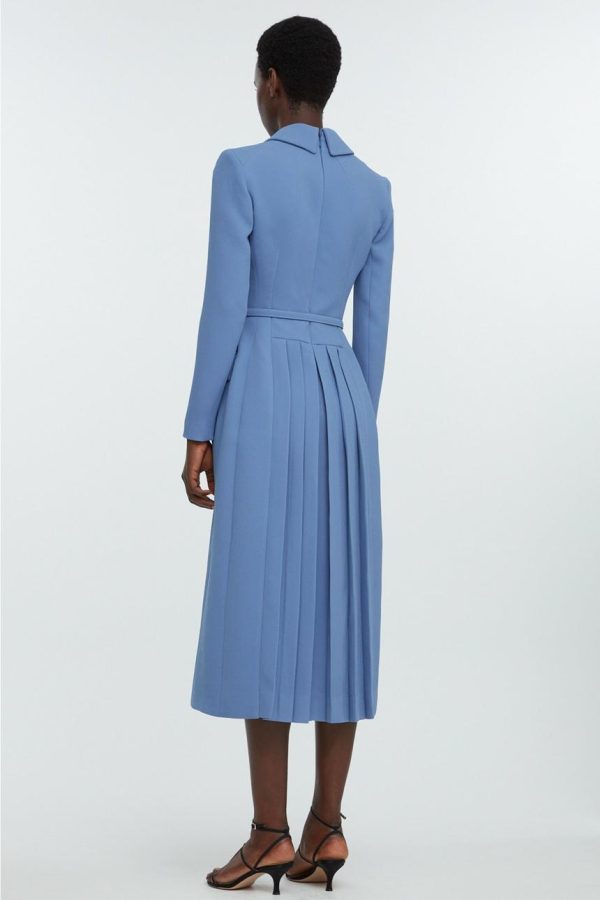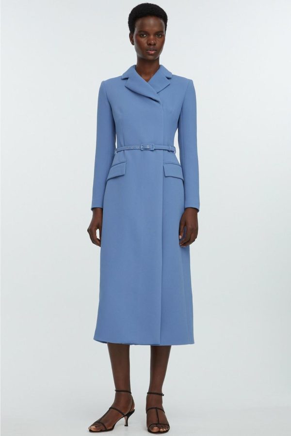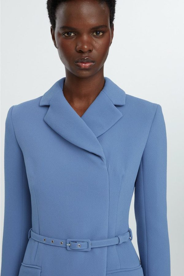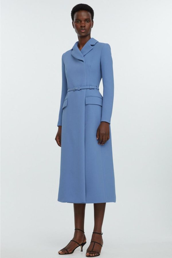 The Kalonice coat dress, a fusion of classic tailoring and modern sophistication. Crafted from luxurious double crepe fabric in a captivating indigo shade, this coat dress exudes timeless elegance. Delicate pleat detailing on the back adds texture and movement, while a sleek belt cinches the waist for a flattering silhouette. Elevate your wardrobe with this versatile coat dress, perfect for both formal occasions and everyday chic.