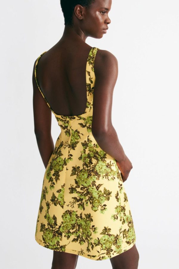 The Tillie mini dress, exquisitely designed with a charming scoop-neck silhouette. Crafted from luxurious yellow taffeta faille adorned with a delicate green rose pattern, this dress is a true statement piece. Subtle darts through the bodice ensure a flattering fit, while the A-line cut adds a touch of elegance to your ensemble.