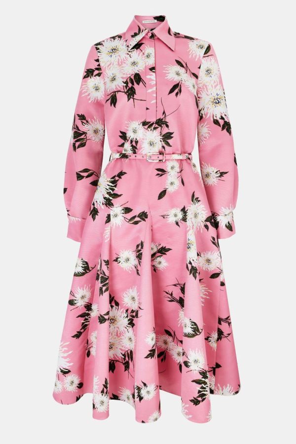 The Emilia Wickstead interpretation of the classic shirt dress is elevated in a weighted quality of tafetta faille with an understated sheen. Printed on a pink base, the Tomasina dress features a delicated dahlia motif, making this long sleeves floral printed dress an easy choice for outdoor occasions. Finished with a self tie belt, pair this piece with the silver Novie sandals.
