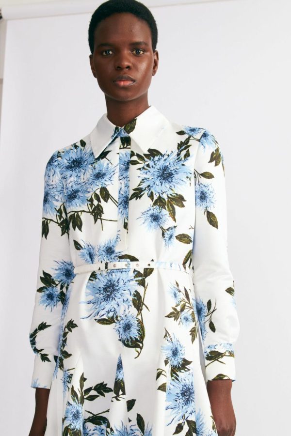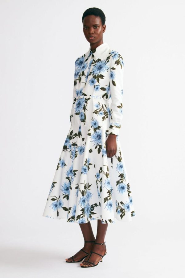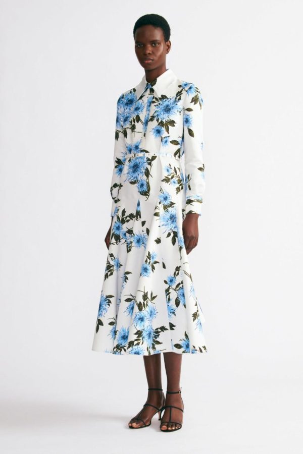 The Tomasina dress, a timeless interpretation of the classic shirt dress, with billowing long sleeves for an elegant touch. Its fit-and-flare silhouette guarantees a flattering profile, enhanced by inserted godets throughout the skirt for added fullness and movement. In a captivating blue rose pattern on white cotton, this versatile piece exudes romantic charm, effortlessly elevating any occasion from casual outings to special events.