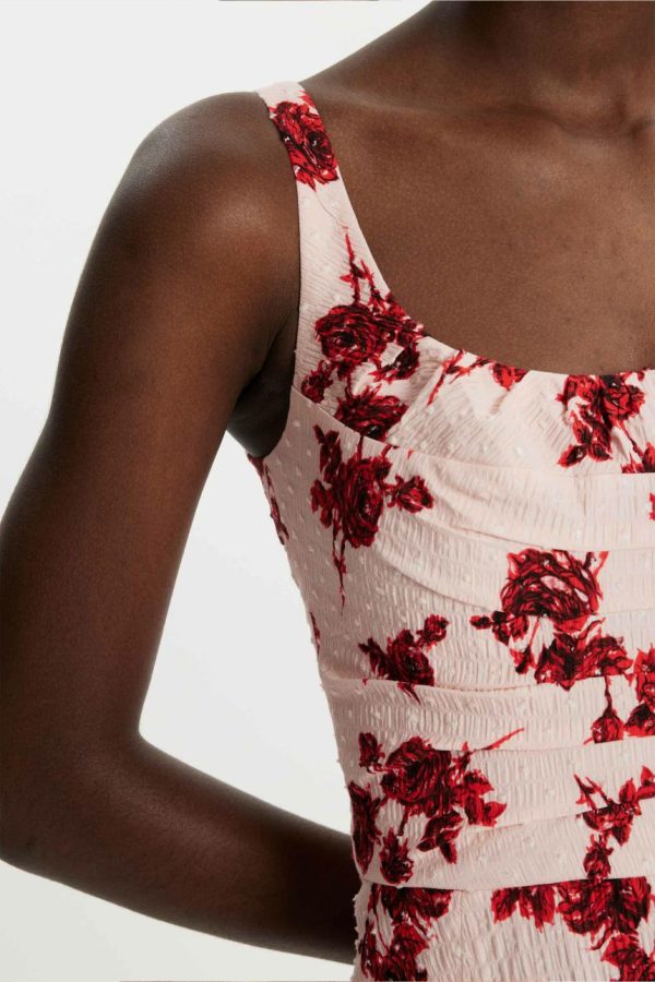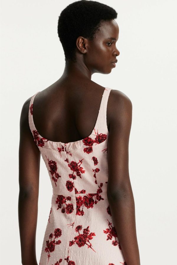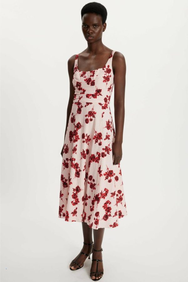 The Verena midi dress, crafted from airy cotton that gracefully drapes over your figure. This midi dress is adorned with a vibrant red rose pattern against a soft pink backdrop, complemented by delicate pleating along the bodice to highlight both the waist and bust. Designed with a mid-length hem and a flattering fit-and-flare silhouette, this ensemble, when paired with the Novie sandals, epitomises the ideal spring/summer occasion look.