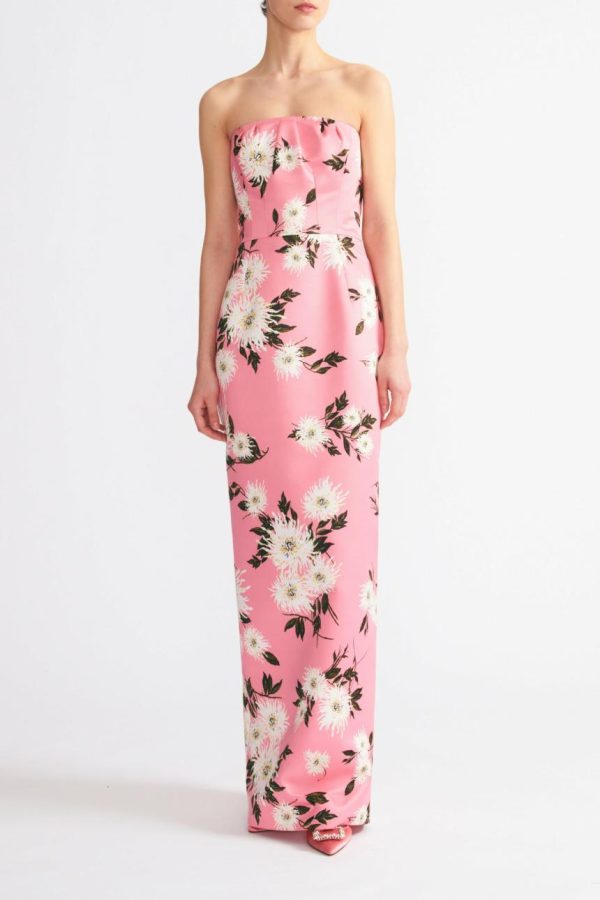 The Emine strapless gown exudes a romantic charm with its taffeta faille fabric adorned in vibrant white florals against a delicate pink hue. Crafted with internal corset to contour and enhance the silhouette, this dress is adorned with a subtle back vent for a refined finish, perfect for summery evening occasions.
