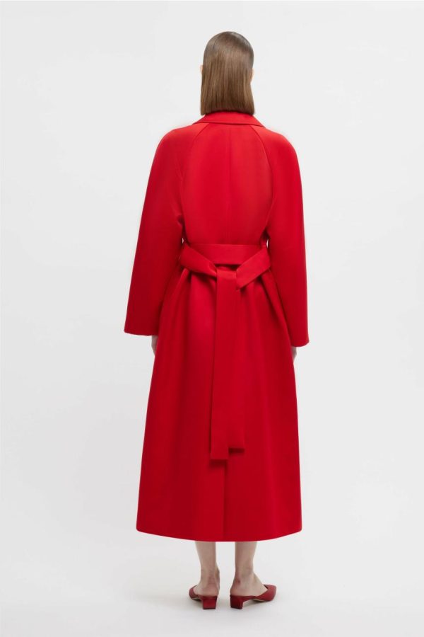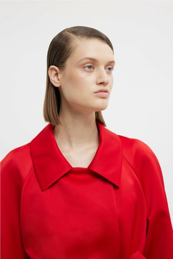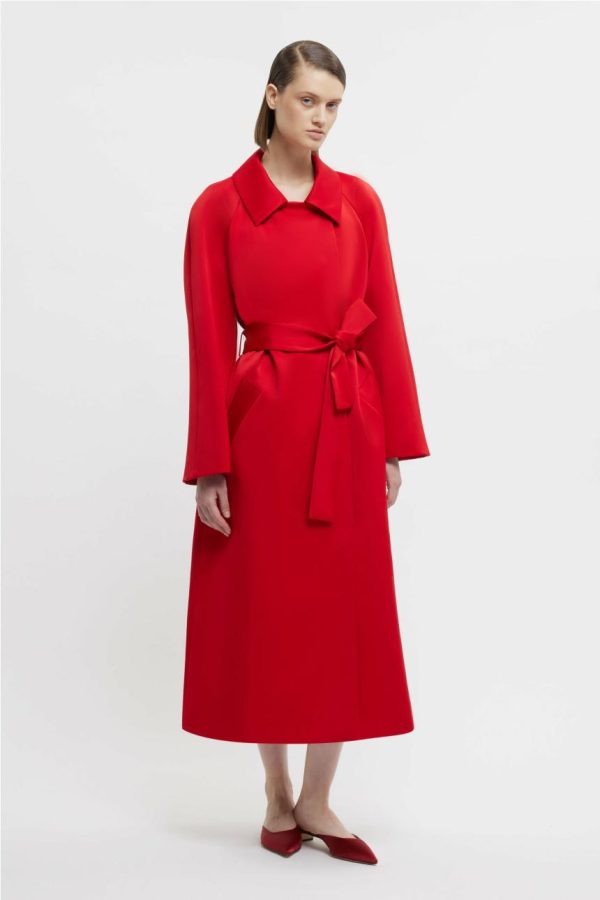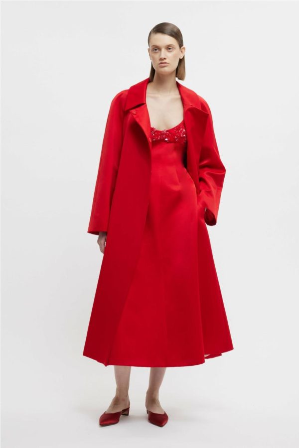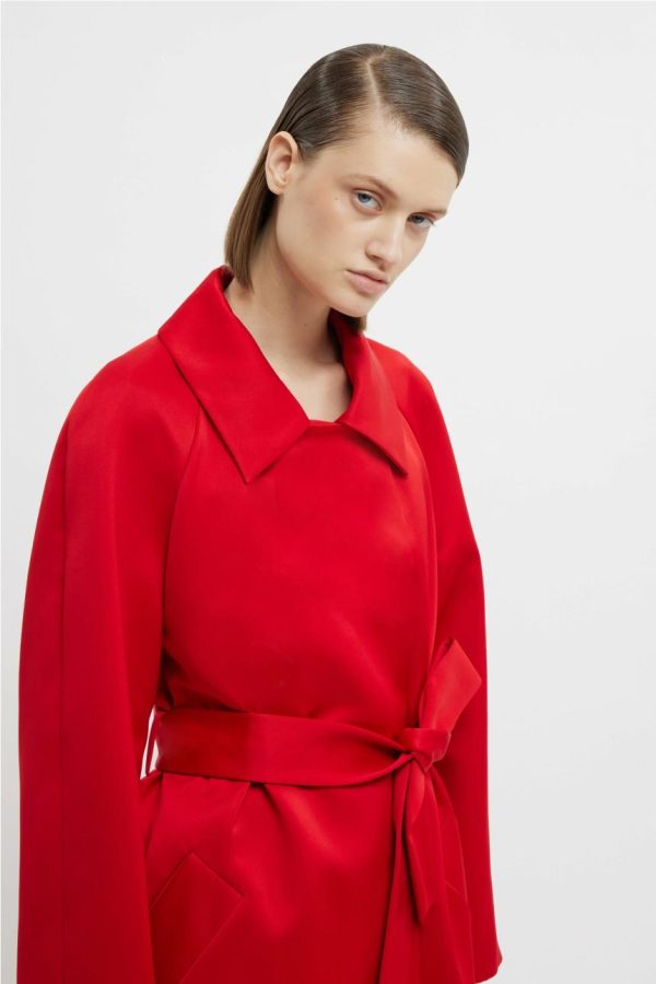 A statement-making coverup that takes notes from old Hollywood elegance, the Hasina trench coat adds instant impact to your look. Fitted to a semi-oversized silhouette, this red satin evening coat is finished with inserted pockets and a self-tie belt. Wear over the coordinating Abella Dress for added glamour.