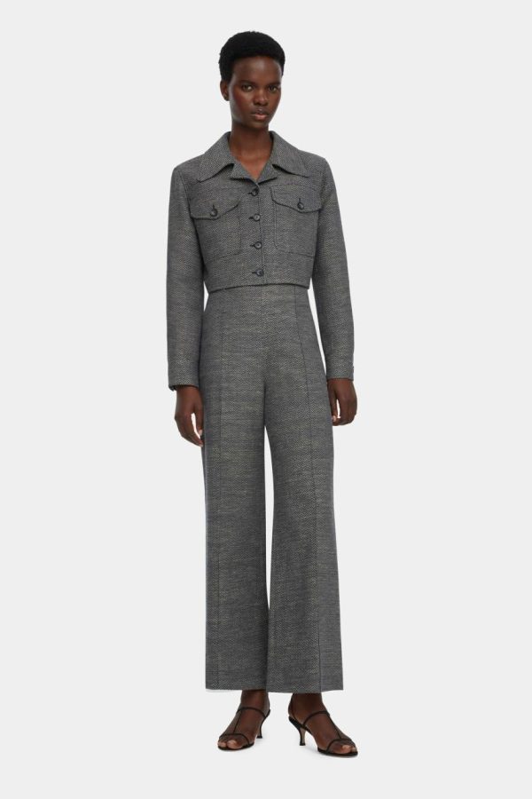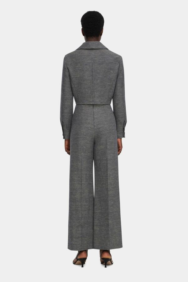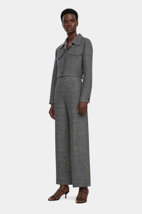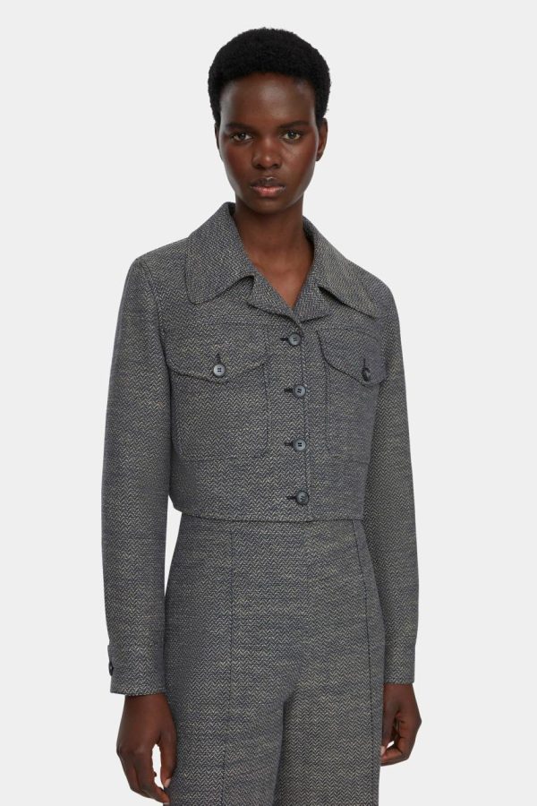 Elevate your style with the Nics cropped jacket. Cut from elegant navy and ivory chevron weave, this cropped jacket features classic patch pockets and buttoned cuffs for a modern twist on utilitarian charm. Pair with coordinating Daffy trousers for a cohesive, classic work look.