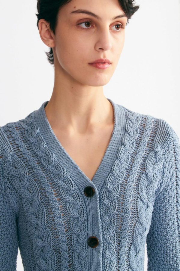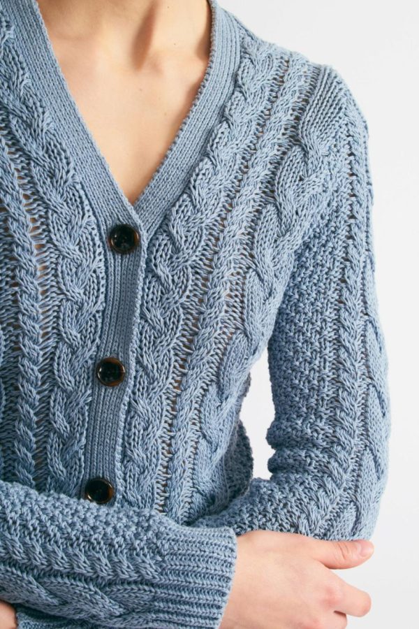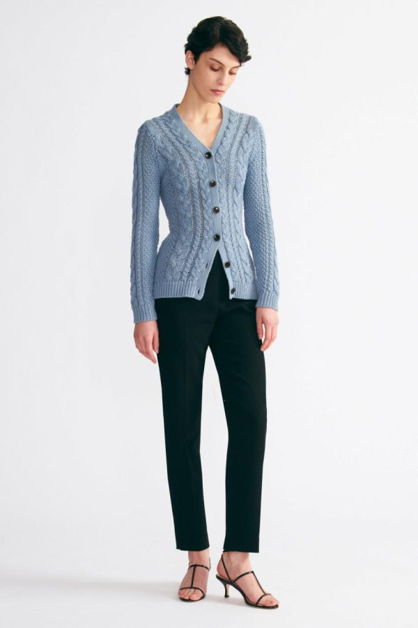 The Elmer is a timeless V-neck cable knit cardigan exuding sophistication and comfort. Crafted from 100% wool in a smoke blue hue, it offers warmth and durability for timeless style. The vertical line of tortoiseshell buttons adds refined elegance, accentuated by the intricate cable knit detail down the front. Whether for casual outings or formal affairs, the Elmer cardigan effortlessly blends versatility and style, ensuring you make a statement with every wear.
