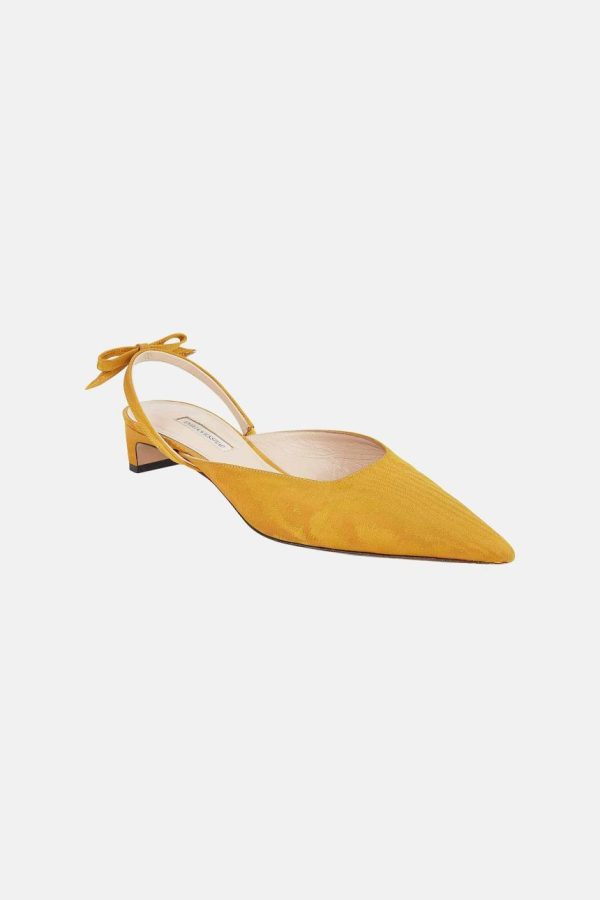 Crafted in ochre moire mikado, the Konna heel combines a classic kitten heel with a playful bow-back detail for a touch of whimsy. The sling-back style ensures a secure and comfortable fit, making it an ideal choice for both formal events and everyday outings.