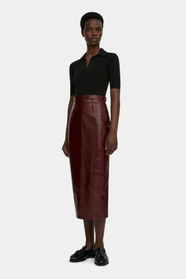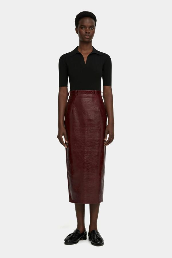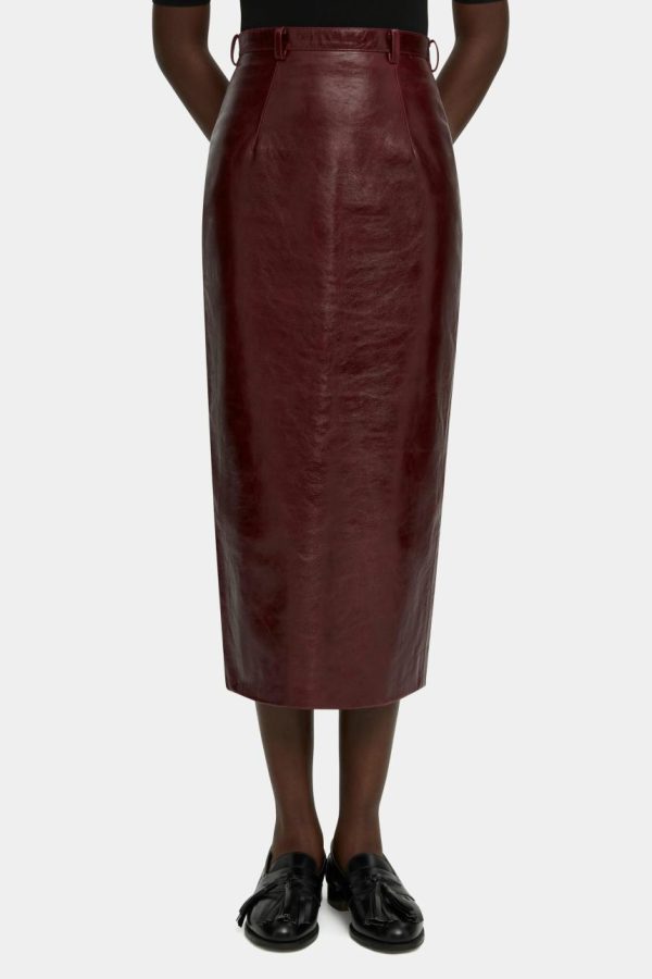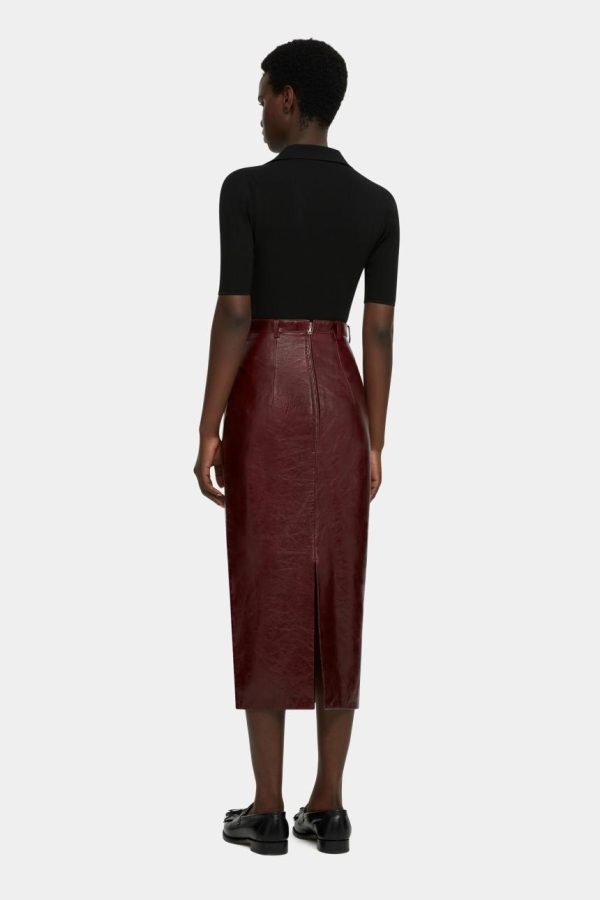 The Lorelei pencil skirt follows the Emilia Wickstead feminine tailoring, constructed from a supple leather in an oxblood tone. The Lorelei pencil skirt it cut to a high waist and is finished with a vent at the back. this skirt exudes sophistication and grace, offering both style and comfort for any occasion.